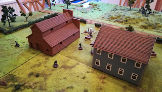 The first turn saw both companies making a dash across no man's land towards the barn. the only thing curbing our respective enthusiasm was the prospect of meeting those Zombies. Knowing they would ignore the first failed pluck roll had us worried.